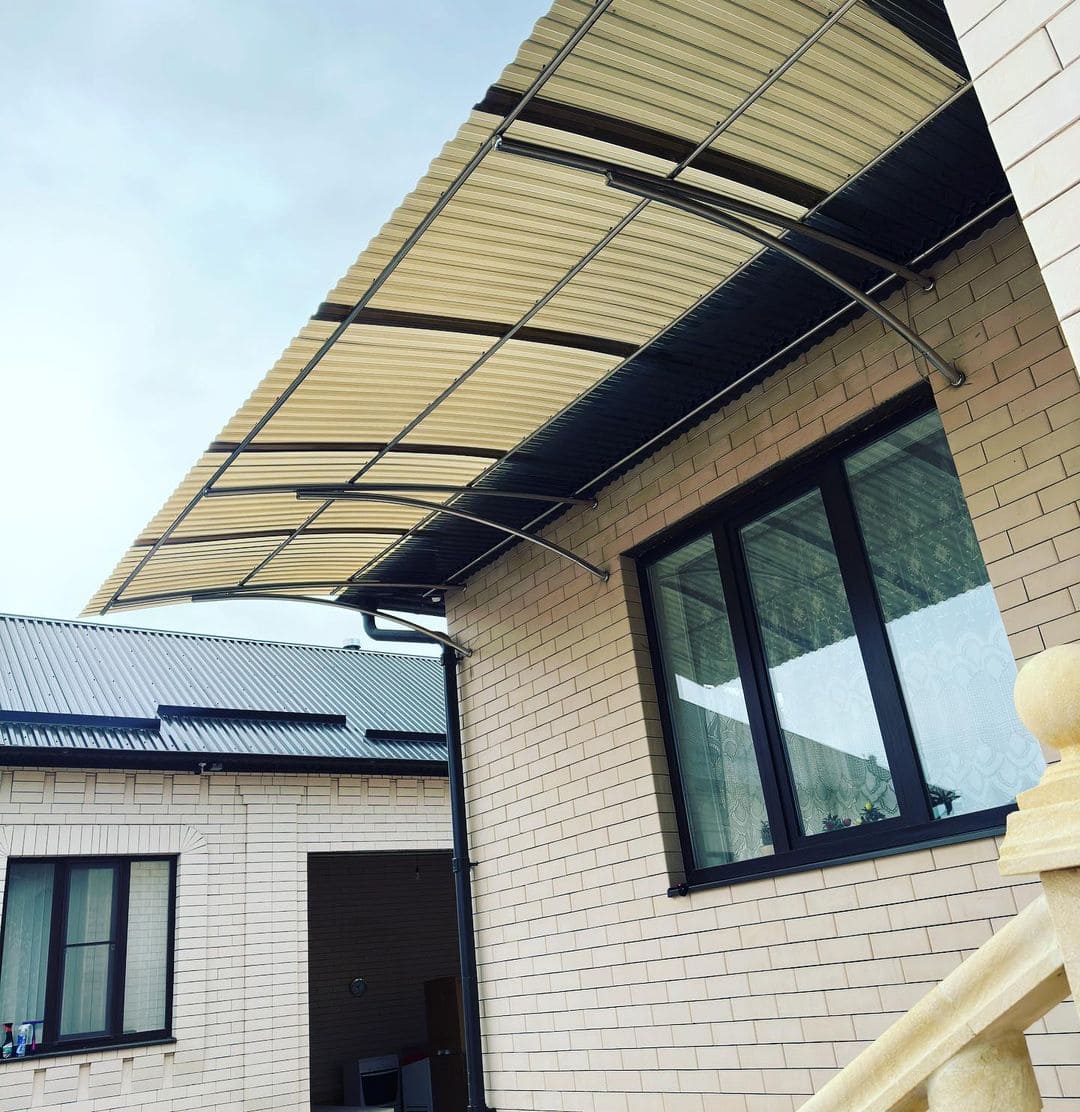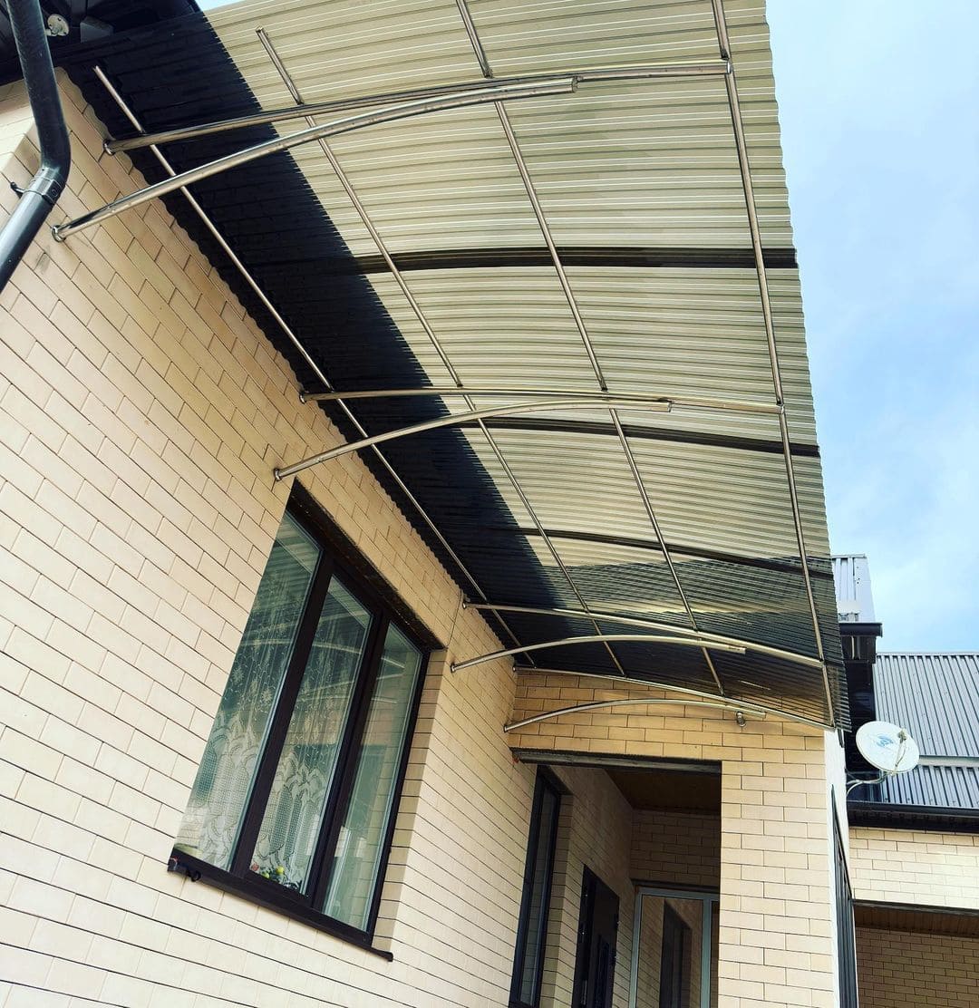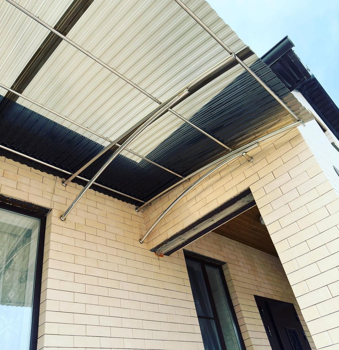 Навес или козырек может быть как типовой, так и выполнен по индивидуальным размерам. Дизайн навеса формируется с выбора материала и проектирования конструкции с расчетом нагрузки