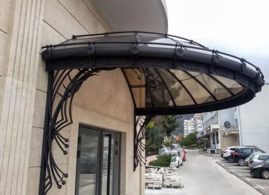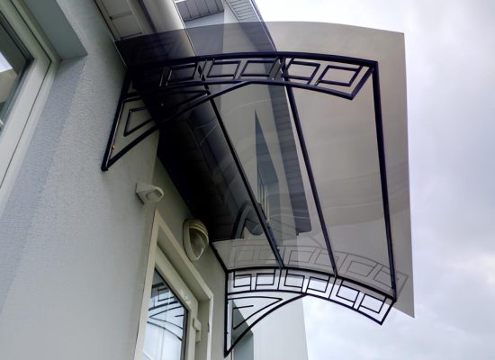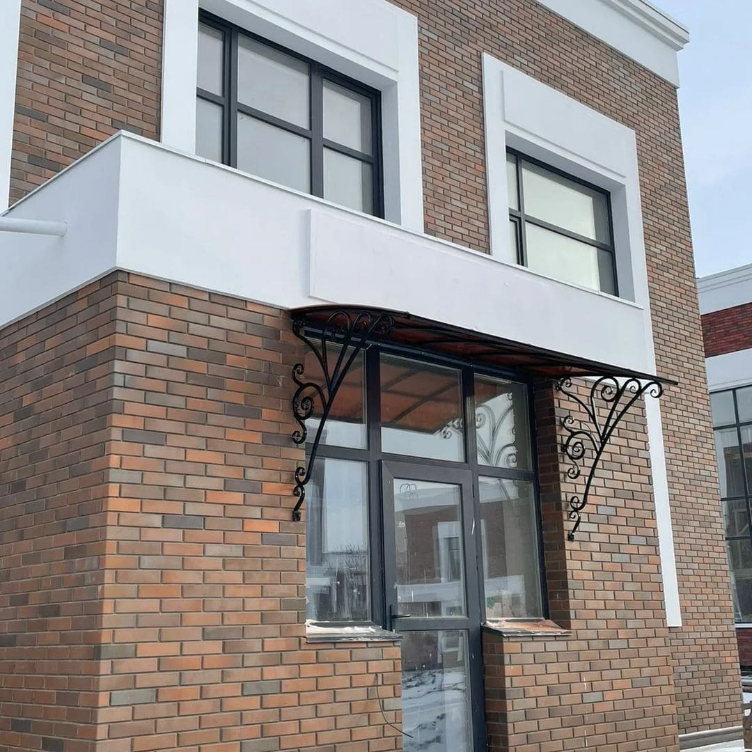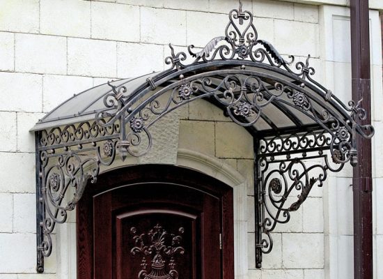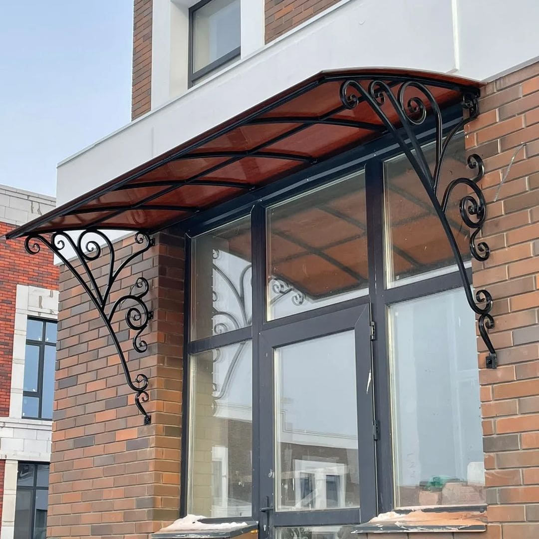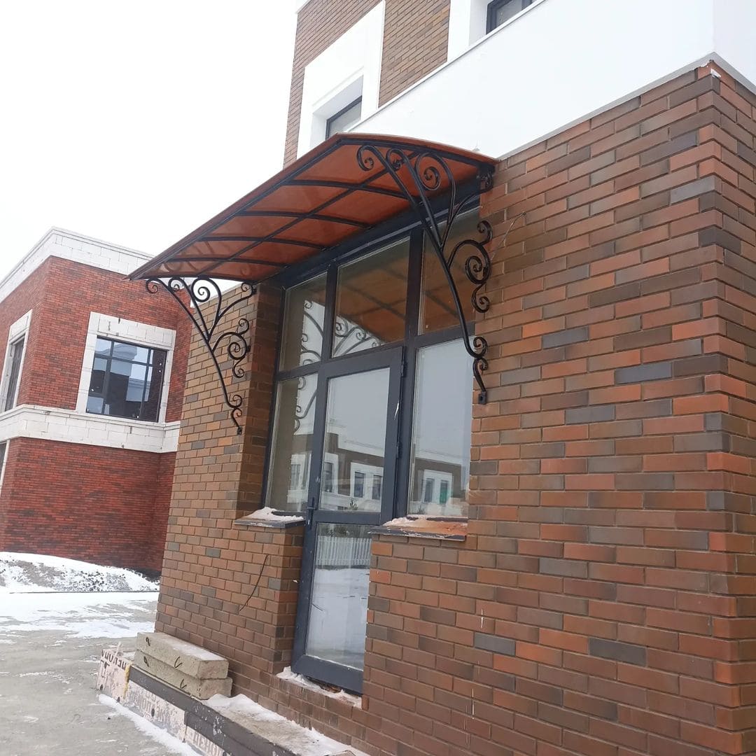 Навес или козырек может быть как типовой, так и выполнен по индивидуальным размерам. Дизайн навеса формируется с выбора материала и проектирования конструкции с расчетом нагрузки