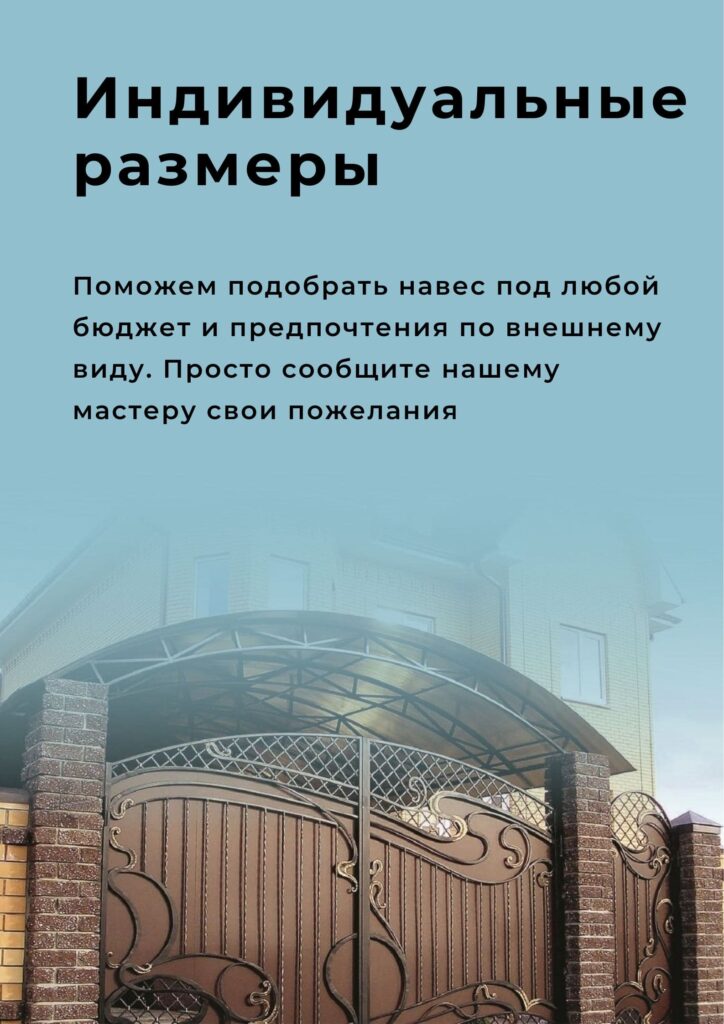 Мы специализируемся на индивидуальном изготовлении навесов по размерам клиента. Это позволяет адаптировать готовое изделие к потребностям пользователя. К примеру, вы можете заказать навес на один или два автомобиля в зависимости от того, сколько транспортных средств используются в вашей семье.
